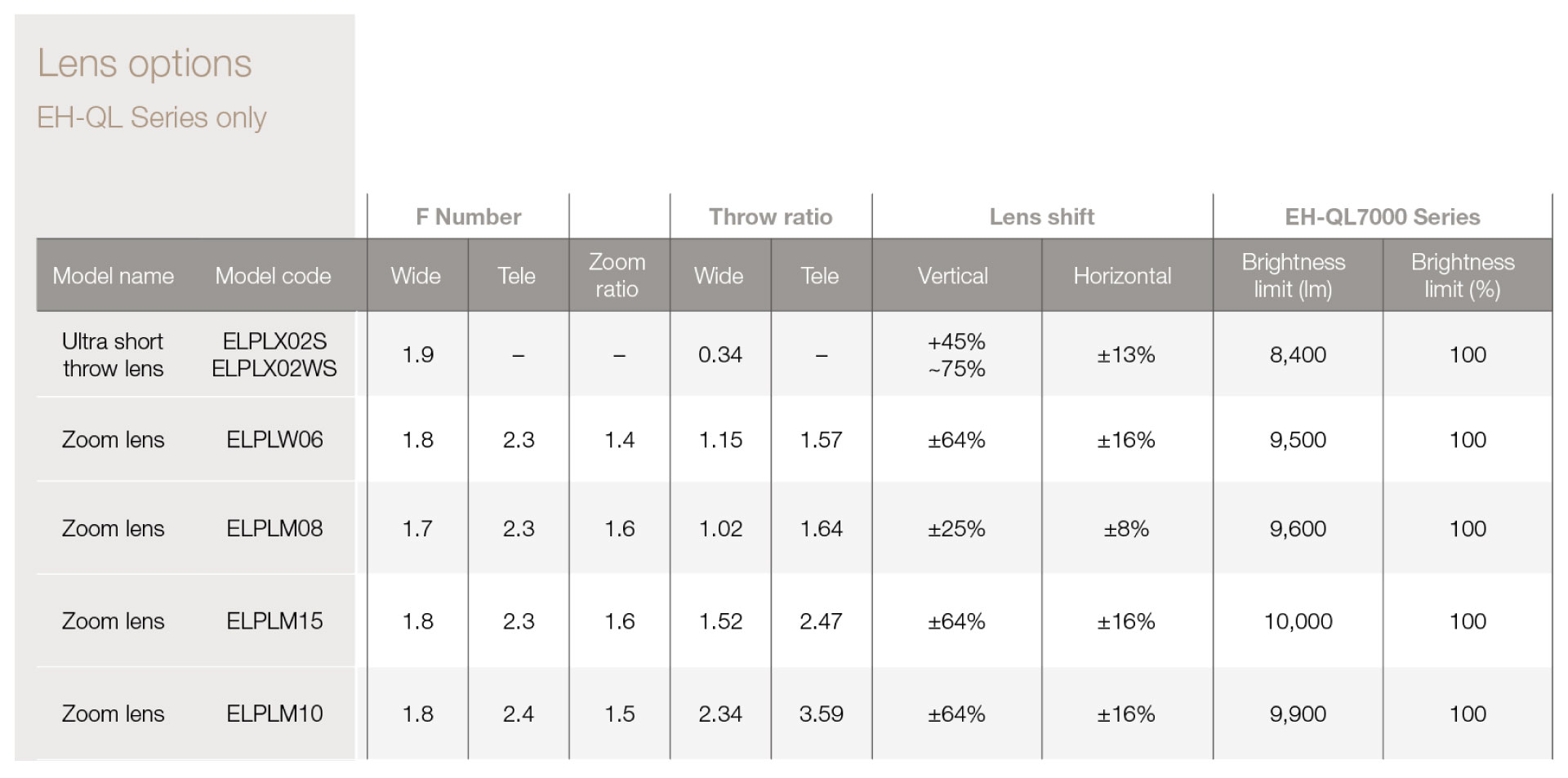 Compatible with a wide range of interchangeable lenses, the EH-QL7000W is easily configured to provide the desired image size, at optimal quality, in any media space. Including options such as an ultra-short throw, zero-offset lens that allow it to be discreetly installed on surfaces such as ceilings, the EH-QL7000W's interchangeable lenses also mean that you can easily adjust the throw distance to project images from different distances without moving the projector.